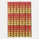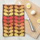Kitchen towel in a Mid-Century Modern Danish inspired textile pattern of stylised leaves - fire colours shading from deep mandarin orange to golden yellow, accented with tan, on a dark chocolate brown background