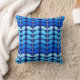 Throw pillow in a Mid-Century Modern Danish inspired textile pattern of stylised leaves - shades of blue, from light sky blue to deep cobalt, accented with white, on a dark navy / indigo blue background