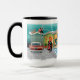 Mid Century Decorating Christmas Mug. This scene, from one of our most popular Christmas cards, shows all the excitement of a mid-century modern house being decorated for the Christmas Holidays. A family is joyfully working to deck the halls of this folded plate roof house, a mid century icon, completely furnished with classic MCM furniture and an aluminium tree. It will take you back to a 1950s Christmas.