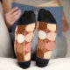Socks in a Mid-Century Modern geometric print of giant dots, in a grid of nine coordinating colours - shades of tan, dark brown, rust, terracotta and cream, on a chocolate brown background