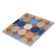 Ceramic tile in a Mid-Century Modern geometric print of giant dots, in a grid of nine coordinating colours - shades of beige, cream, terracotta, light, medium and dark blue, on a taupe tan background