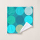 Towel set in a Mid-Century Modern geometric print of giant dots, in a grid of nine coordinating colors - shades of turquoise, aqua, seafoam green and beige, on a medium teal background