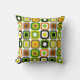 Mid-Century Modern Pillow funky abstract squares and circles in a brightly colourful design in shades of green grey, black brown and gold. Back of pillow in coordinating design. Perfect for any mid-century modern home and lifestyle.