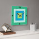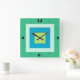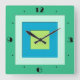 Overlapping cut out layers form a classic, Mid-Century Modern geometric design in light and deep jade green with turquoise and lime green accents