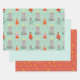 Mod women Christmas wrapping paper. 50s style retro, pink and mint green. Pink Holiday trees with mid century women and their cats. Second sheet is solid mint green, and the 3rd is Merry Christmas wording, gold stars on red.