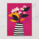 A bright fuchsia bouquet dances in a black-striped vase on a zesty yellow background—high-energy and eye-catching.
