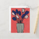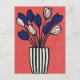 Bold cobalt petals bloom above a pink-striped vase, evoking a playful mid-century mood on a soft coral base.