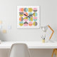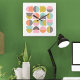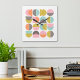 This clock features a mid century modern inspired design with coloured geometric abstract shapes.