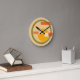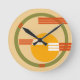 This clock has a mid-century modern abstract design of a gold circle inside a green circle with orange and white stripes.
