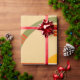 This wrapping paper has a mid-century modern abstract design of a gold circle inside a green circle with orange and white stripes.