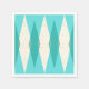 These Mid Century Modern Argyle Paper Cocktail Napkins (large print) feature a vibrant, turquoise background and a pattern of mod, translucent teal diamonds overlaying larger, vintage cream diamonds with gold coloured, space age speckles. This minimalist inspired, deconstructed argyle is a simplistic throwback of the larger than life atomic era that dominated the decorating landscape of the 1950s and 1960s. This kitschy design is reminiscent of everything from retro Palm Springs’ bowling alley signs to the television trays you used at your grandma’s house.