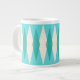 This Mid Century Modern Argyle Jumbo Mug features a vibrant, turquoise background and a pattern of mod, translucent teal diamonds overlaying larger, vintage cream diamonds with gold coloured, space age speckles. This minimalist inspired, deconstructed argyle is a simplistic throwback of the larger than life atomic era that dominated the decorating landscape of the 1950s and 1960s. This kitschy design is reminiscent of everything from retro Palm Springs’ bowling alley signs to the television trays you used at your grandma’s house.
