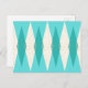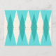 This Mid Century Modern Argyle Postcard features a vibrant, turquoise background and a pattern of mod, translucent teal diamonds overlaying larger, vintage cream diamonds with gold coloured, space age speckles. This minimalist inspired, deconstructed argyle is a simplistic throwback of the larger than life atomic era that dominated the decorating landscape of the 1950s and 1960s. This kitschy design is reminiscent of everything from retro Palm Springs’ bowling alley signs to the television trays you used at your grandma’s house.