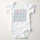 This baby bodysuit has a mid-century modern design of arrows made from lines with different turquoise and beet-coloured shapes attached, on a field of white. Want the same design with different colours? Message me.