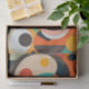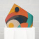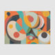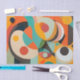 A Mid Century modern painting in various geometric shapes and colours in red, teal, orange, black and green.