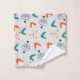 This towel set has a mid-century atomic modern design of boomerang shapes, antennae, and starbursts in teal, orange.
