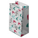 This gift bag has a mid-century atomic modern design of boomerang shapes, antennae, and starbursts in teal, magenta, blue, and black.