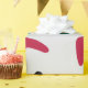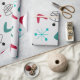 This wrapping paper has a mid-century atomic modern design of boomerang shapes, antennae, and starbursts in teal, magenta, blue, and black.
