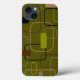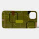 This phone case has a mid-century modern design of rectangles in green, gray, brown, and black.