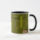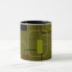 This mug has a mid-century modern design of rectangles in green, gray, brown, and black.