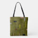 This tote bag has a mid-century modern design of rectangles in green, gray, brown, and black.