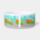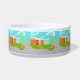 This Mid Century Modern Cartoon House Ceramic Pet Bowl will have you wanting to put out the WELCOME mat and make yourself at home! The 1960's, minimalist art design features a sleek, orange stone and aqua glass house on a lush, green, boomerang shaped lawn. The lawn forms an oasis in the middle of its grey, concrete surroundings. A green palm tree is swaying in the breeze. Four, orange stepping stones lead the way to the retro, red, front door with three, rectangular, glass window panes. To the left of the door, a turquoise flowerpot holds a tropical, green plant. The house has a sloping, V shaped white roof that is pointing towards two, white, kidney bean shaped clouds. The sky is a positively serene shade of aqua. No one will want to throw stones from this modern, glass house design! Buy this kitschy, space age product and be the coolest cat on your block!