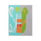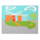 This Mid Century Modern Cartoon House Notepad will have you wanting to put out the WELCOME mat and make yourself at home! The 1960's, minimalist art design features a sleek, orange stone and aqua glass house on a lush, green, boomerang shaped lawn. The lawn forms an oasis in the middle of its grey, concrete surroundings. A green palm tree is swaying in the breeze. Four, orange stepping stones lead the way to the retro, red, front door with three, rectangular, glass window panes. To the left of the door, a turquoise flowerpot holds a tropical, green plant. The house has a sloping, V shaped white roof that is pointing towards two, white, kidney bean shaped clouds. The sky is a positively serene shade of aqua. No one will want to throw stones from this modern, glass house design! Buy this kitschy, space age product and be the coolest cat on your block!