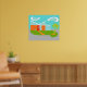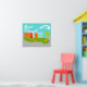 This Mid Century Modern Cartoon House Poster will have you wanting to put out the WELCOME mat and make yourself at home! The 1960's, minimalist art design features a sleek, orange stone and aqua glass house on a lush, green, boomerang shaped lawn. The lawn forms an oasis in the middle of its grey, concrete surroundings. A green palm tree is swaying in the breeze. Four, orange stepping stones lead the way to the retro, red, front door with three, rectangular, glass window panes. To the left of the door, a turquoise flowerpot holds a tropical, green plant. The house has a sloping, V shaped white roof that is pointing towards two, white, kidney bean shaped clouds. The sky is a positively serene shade of aqua. No one will want to throw stones from this modern, glass house design! Buy this kitschy, space age product and be the coolest cat on your block!