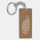 Keychain in a Mid-Century Modern, retro cat design, in a geometric spiral pattern - beige, tan and light brown, outlined in dark chocolate brown, on a medium cocoa brown background
