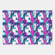 Wrapping paper in a mid-century modern-inspired design featuring two stylised cats in bold, geometric shapes of turquoise, magenta, dark blue, and white. Abstract patterns and retro shapes fill the background, giving it a fun, vintage vibe with a minimalist edge.