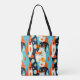 Bag in a mid-century modern-inspired design featuring two stylised cats in bold, geometric shapes of orange, teal, black, and white. Abstract patterns and retro shapes fill the background, giving it a fun, vintage vibe with a minimalist edge.