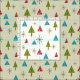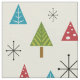 A vintage atomic era pattern with colourful green, blue and red Christmas trees with cool retro patterns, as well as sputnik starbursts.