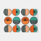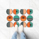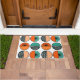 This doormat has a mid-century modern design of half-circles in teal and orange with half of a starburst in some and tiny repeating circles in others.