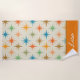 This is custom personalised beach towel featuring elegant mid century modern colourful atomic starburst pattern in different vibrant retro colours.