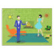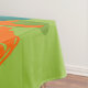This Mid Century Modern Couple Tablecloth looks like a scene out of a romantic comedy. The 1960's style, minimalist art design features an attractive cartoon couple enjoying a romantic evening at home. The sophisticated room prominently features a green stone wall with a roaring fire in the fireplace. The furnishings in the room include an orange, lounge chair with matching footstool, a red, starburst wall clock, a yellow, sputnik light fixture, and an orange side table, which is home to a green, portable record player. On the floor beside the end table, a vinyl record can be seen poking out of a kitschy album cover. In the centre of the green flooring, there is a large, rectangular, teal rug. In the middle of the scene, we have a very sophisticated couple. There is a suave man in a royal blue suit, white shirt and blue bow tie. The tall, dark and handsome man is gazing at his lovely companion. The elegant, raven haired woman is wearing a flouncy aqua dress. They are each holding a crystal martini glass with a floating olive. Cheers! Here's to the perfect evening at home!