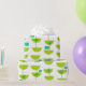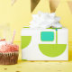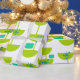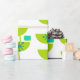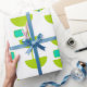 This wrapping paper has a Mid-century modern design of green half-circles that look like cups strung together with turquoise starbursts and rectangles.