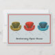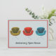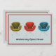 Shown here for a 50th Wedding Anniversary, this modern contemporary invitation with vintage retro chairs will impress your guests with their special style. Personalise it for your own memorable event and add your own custom details on the back. Green, red and teal blue midcentury Eames inspired chairs on soft grey background with red accent trim.