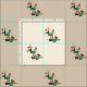 A vintage styled abstract art design, inspire by the 1950s atomic era movement, has bold lines and colourful square & rectangles in turquoise, orange, yellow and brown against a tan background.