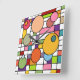 This wall clock has a mid-century modern design of a grid with some rectangles coloured in and circles on top in retro colours.