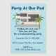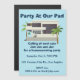 Mid Century Modern housewarming party invitation. The house is of the type seen in Southern California with text saying "Party At Our Pad" and "Calling all cool cats" for that mid century slang vibe.