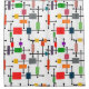 This shower curtain has a mid-century modern design of a large grid of horizontal and vertical black lines with colorful rectangles.