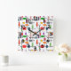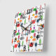 This wall clock has a mid-century modern design of a large grid of horizontal and vertical black lines with colorful rectangles.