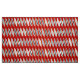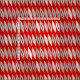 Fabric in a Mid-Century Modern design of abstract leaves in shades of light silver grey / grey to medium grey,accented with graphite grey and tomato red, on a dark Chinese red background