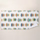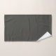 This towel set has a turquoise washcloth, a charcoal black hand towel, and a bath towel with a mid-century modern design of semicircles stacked in three in retro colours on a field of white. Want the same design with different colours? Message me.