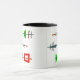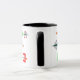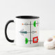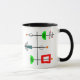 This mug has a mid-century modern design that looks like a mobile with half circles, skewed rectangle, triangle, lines, and circles in red, green, teal, orange and black.