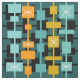 A simple yet colourful contemporary mid century modern geometric pattern with squares and rectangles and lines. Turquoise, yellow and orange against a teal green background.