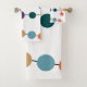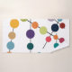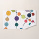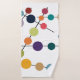 This towel set has a mid-century modern design of black lines with circles of different colours and sizes on a field of white.