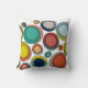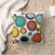 This throw pillow has a mid-century modern design of groups of three ovals in retro colors scattered across the design.