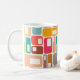 This mug has a mid-century modern design of rectangles with a white hole in retro colours.