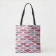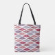 This tote bag has a mid-century modern design of flattened diamonds in retro shades of purple and pink.